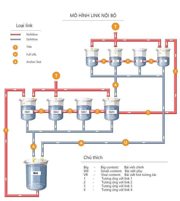 Bạn hãy tưởng tượng như Viral content là những cốc nước nhỏ có đầy nước sẽ hình thành các dòng nước đi qua ống nước là link. Qua đó dòng nước chảy vào những cốc nước to là Small content, rồi từ các cốc nước Small content đó lại đưa dòng nước chảy vào bình nước lớn là Big content.